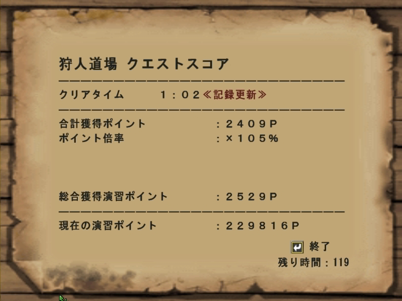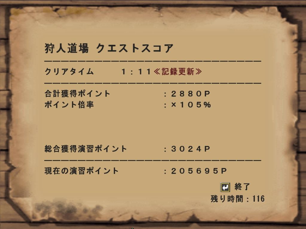 こんなに演習ゲリョスに必死になるとは…必死に頑張れば1分切れそ。