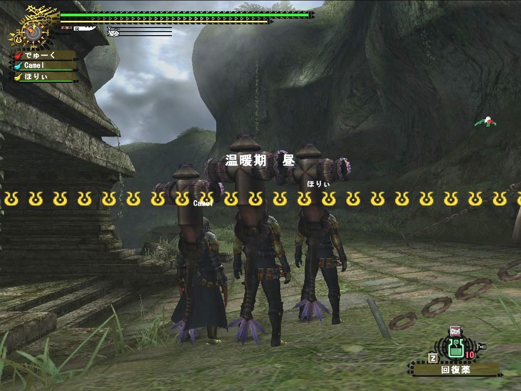 とりあえず皆でスタート後はピーヒャラ。凄くお揃い装備です。