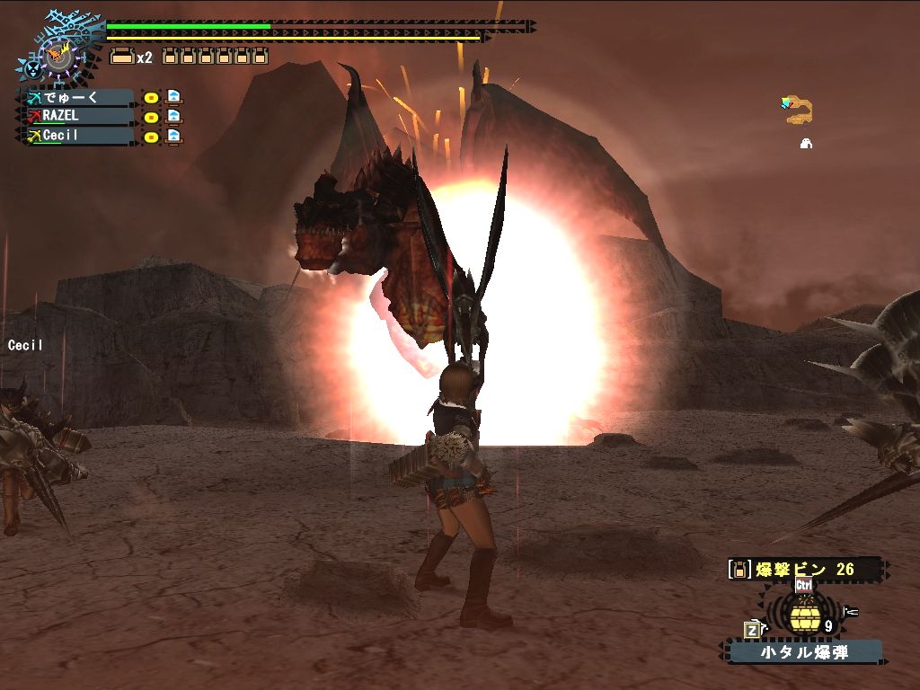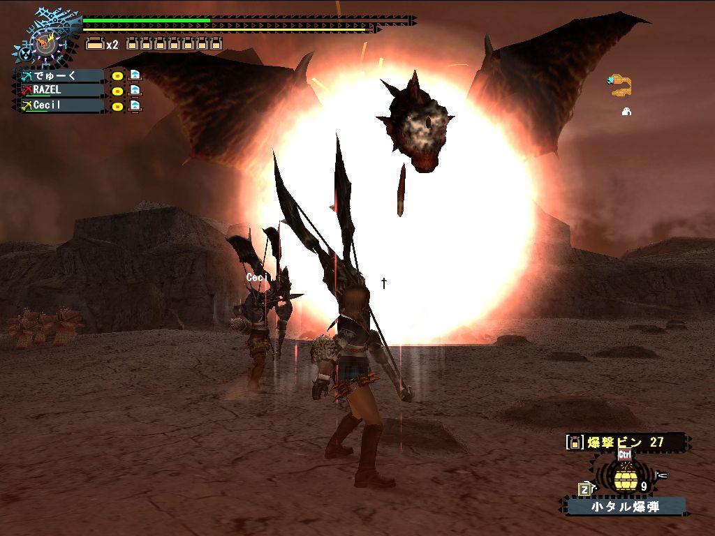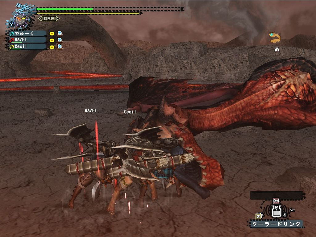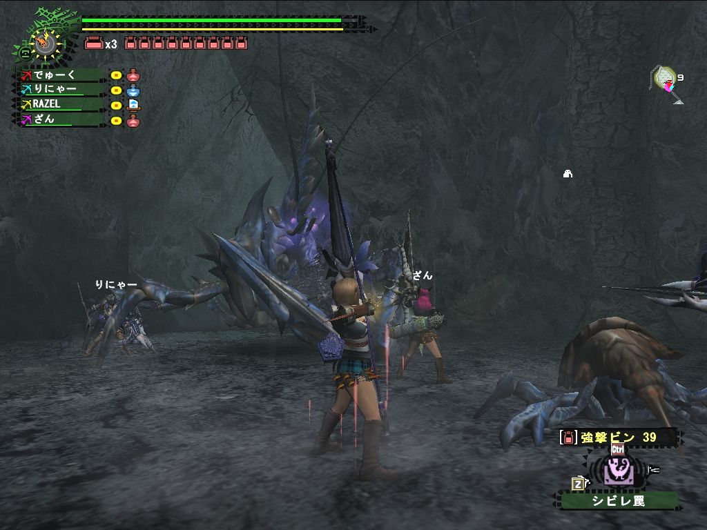 遠距離武器潰しといわれるギザミも4人なら楽々。若干数名ほど矢斬りを
