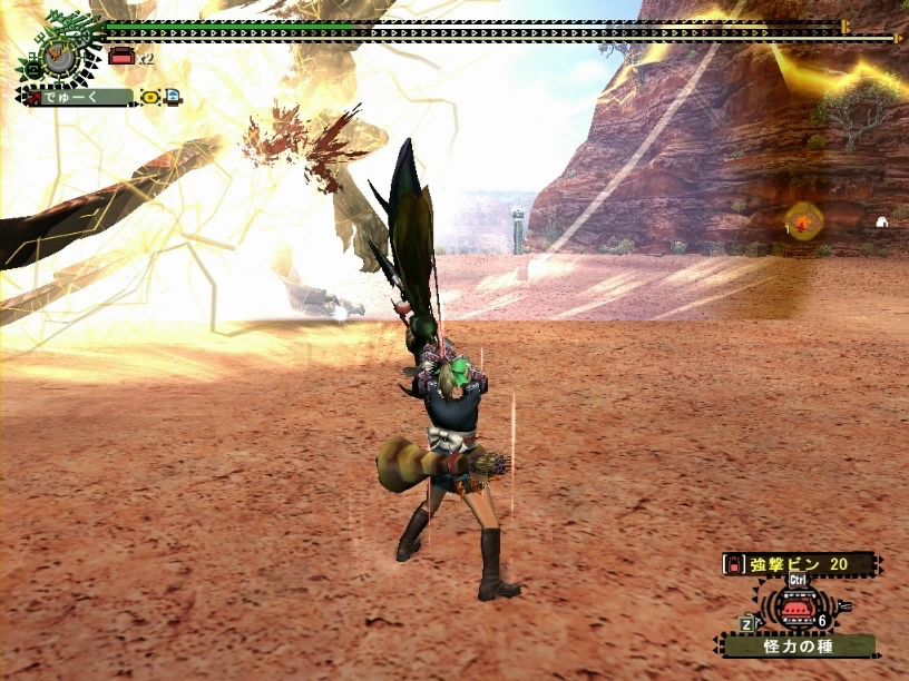 当たり判定があり、風圧大が発生&着地点に電撃が。弓では風圧を