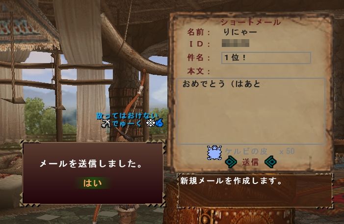 新しく実装されたアイテム添付システムで、頑張ってくれた感謝と1位を
