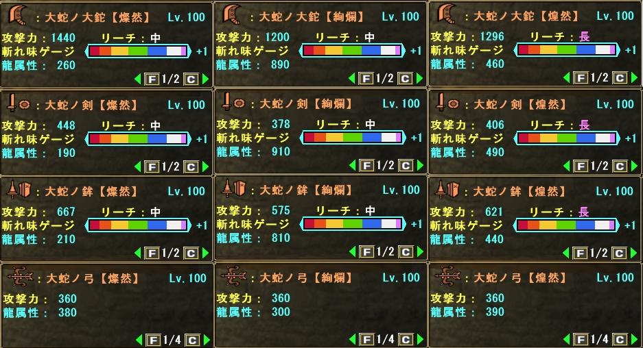 大蛇ノ大鉈・大蛇ノ剣・大蛇ノ弓…どれも強すぎわろた…。しかし強化が