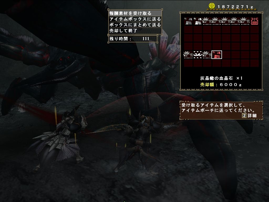 報酬からはめでたく血結晶がっ。部位破壊扱いだからやっぱり尻尾の